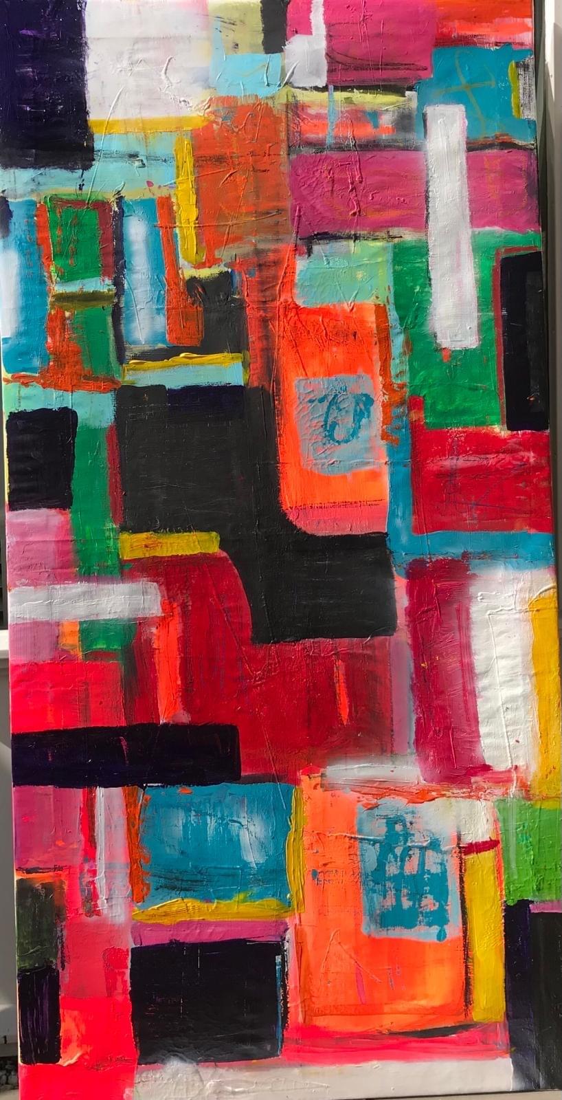 Abstract schilderij met hoogwaardige acrylverf op professioneel galeriedoek. Glanzende vernis wordt aangebracht om het schilderij te verzegelen, te beschermen en om de kleuren nog levendiger te laten lijken.